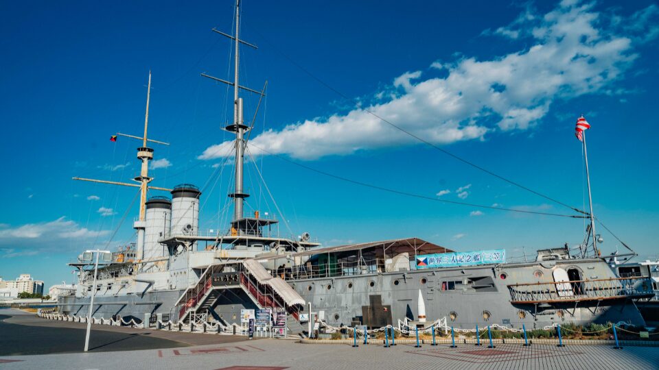 日露戦争で活躍した戦艦「三笠」を見学できる歴史スポット。艦内では当時の資料や装備の見学、VR体験などができる。ミリタリーファンにもおすすめ!