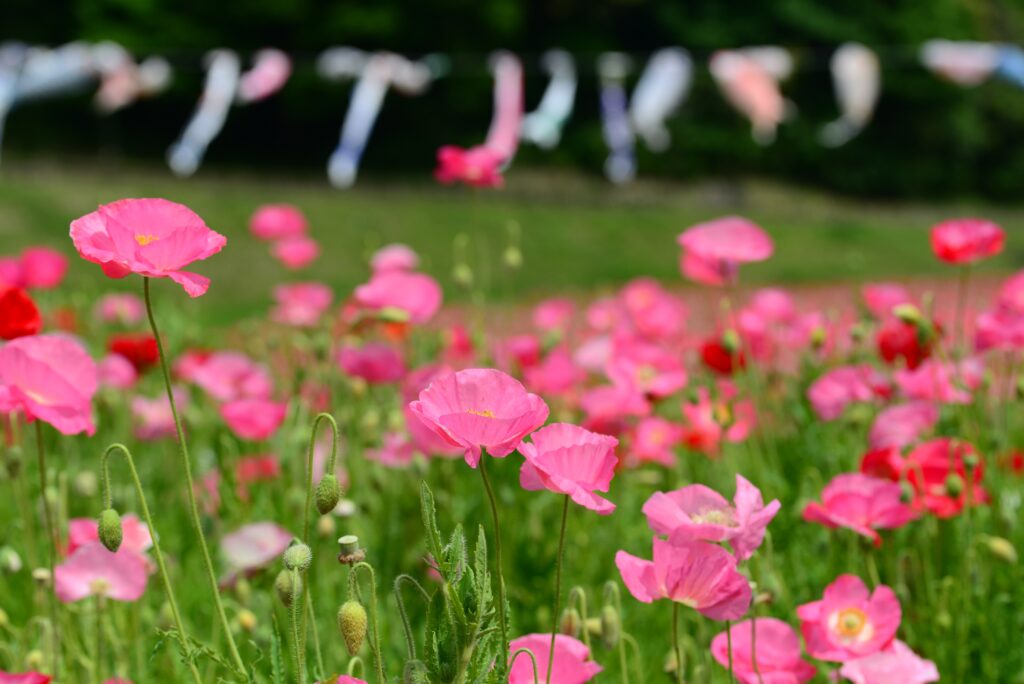 Numerous colorful koinobori (carp streamers) will gracefully dance in the sky above the poppy garden.