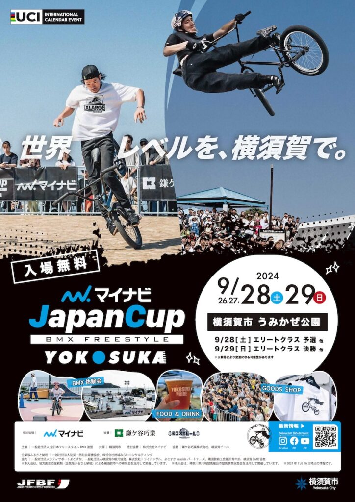 The Mynavi Japan Cup Yokosuka 2024 is an international BMX Freestyle competition (Class-1), offering an electrifying showcase of this high-energy urban sport. With live DJ sets, MC commentary, and a fusion of music, fashion, and sports, it’s more than just a competition—it’s a cultural festival! Admission is free, so come and enjoy the thrilling performances!
