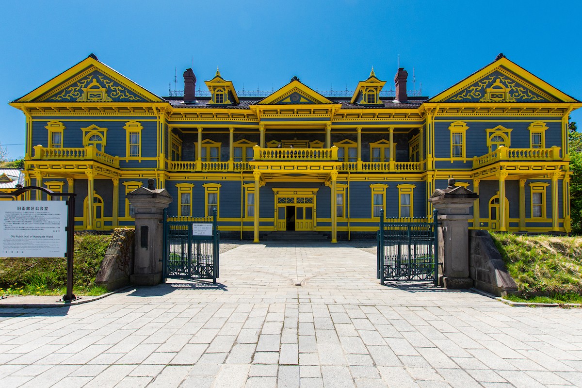 Die alte Stadthalle des Bezirks Hakodate wurde 1910 erbaut und ist ein symmetrisches, schönes Gebäude im Kolonialstil mit blau-grauen und gelben Farben.
