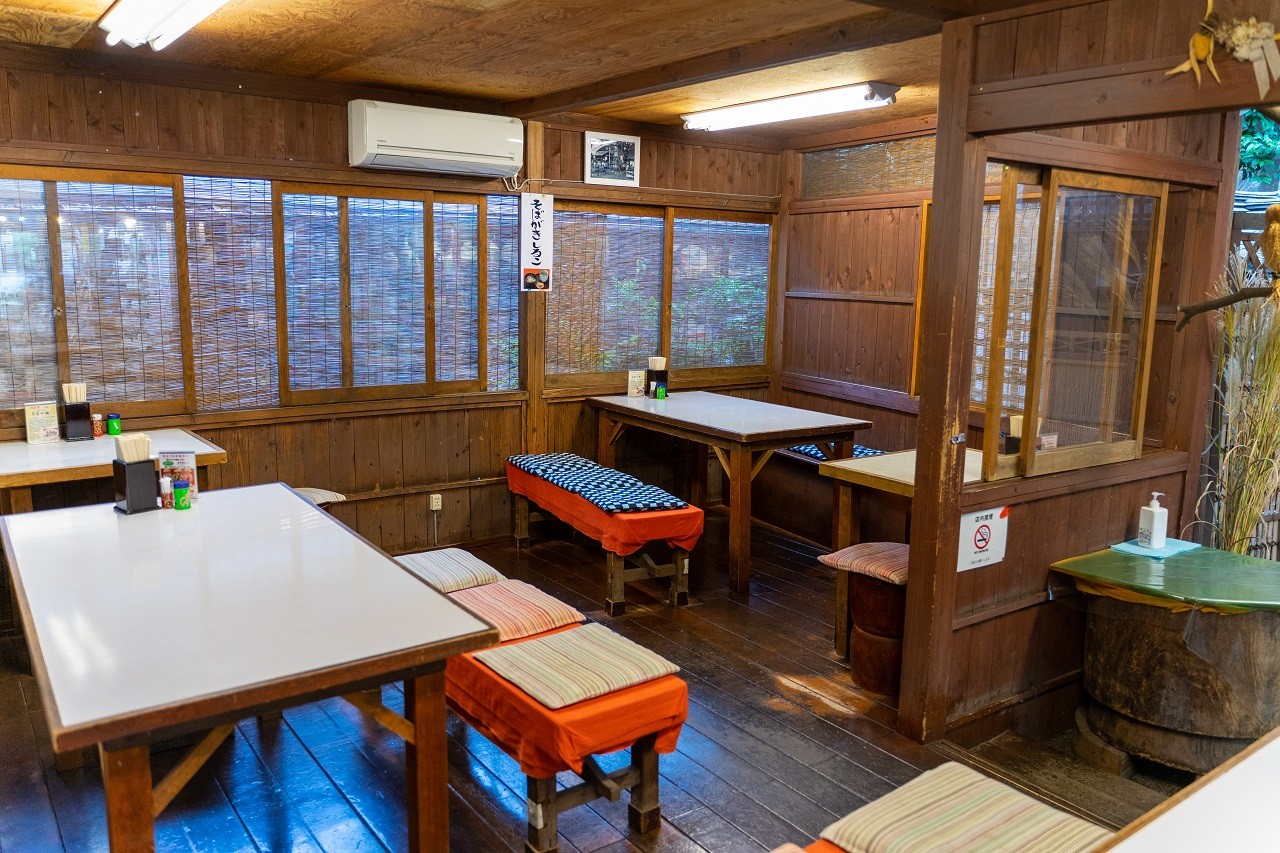 Adequate ventilation is ensured so that customers can enjoy soba noodles with a sense of safety and security. Enjoy the meals served only in Jindaiji sitting at the tables that provide an open feeling.