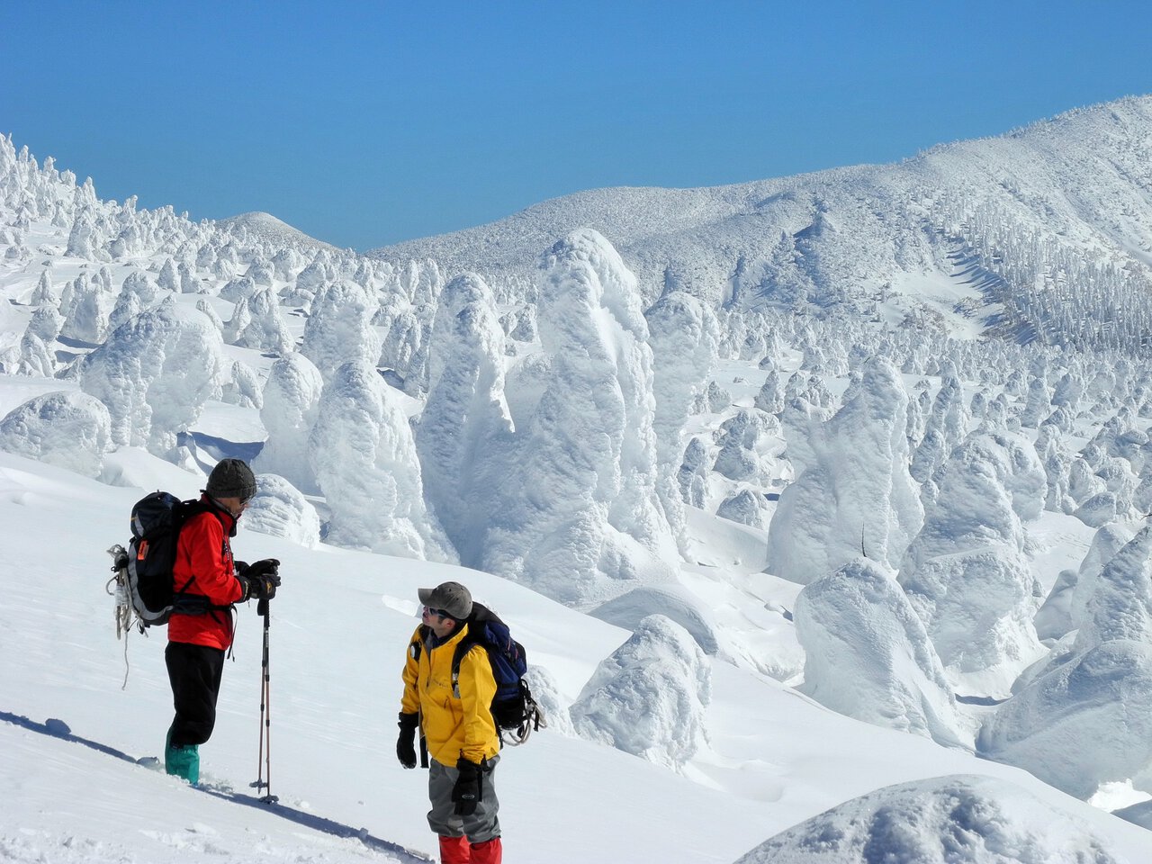 Biasa disebut Monster Es, ini adalah pemandangan musim dingin yang unik dari Zao yang dibentuk oleh butiran es yang menumpuk di pohon cemara Maries (Abies mariesii).