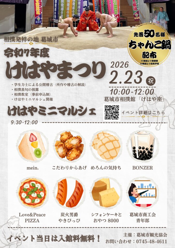 令和8年2月23日(月・祝)、 相撲の開祖とされる「當麻蹶速(たいまのけはや)」にちなんだ「けはやまつり」を、葛城市相撲館「けはや座」にて開催します。