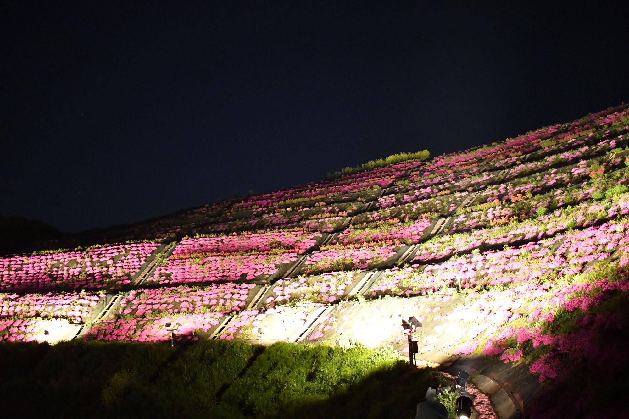 柔らかい光が夜桜を照らし、松井絵里奈さんとラブクラフトさんのライブがライトに照らされる芝桜から葛城市の夜景が見える様子は素晴らしかったです。