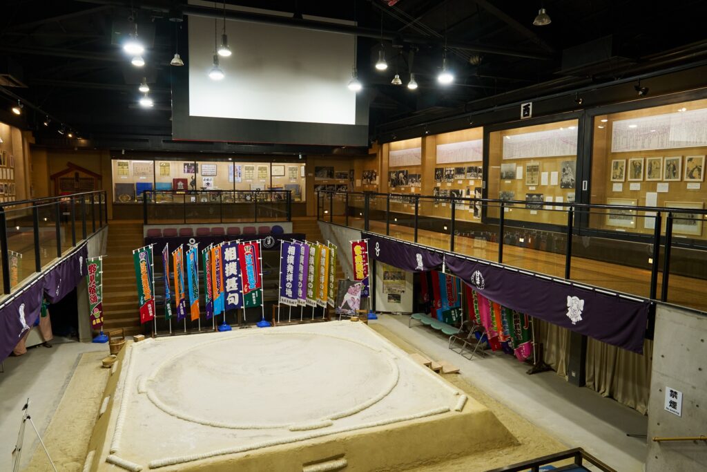 館内1階中央にある土俵は、本場所と同じサイズで造られており、展示土俵であるため、老若男女問わず、誰でも自由に上がって土俵の広さを体験したり塩巻きの体験ができます。正面・向正面には枡席もあり、大相撲の雰囲気を味わえます。