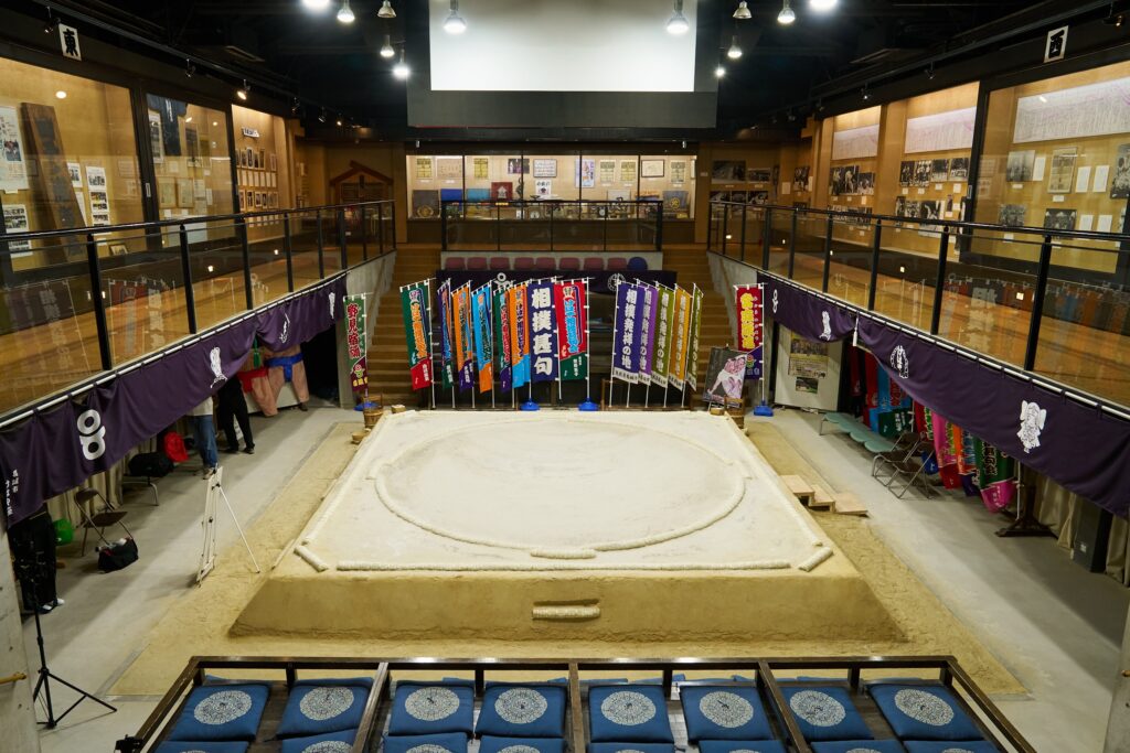 館内1階中央にある土俵は、本場所と同じサイズで造られており、展示土俵であるため、老若男女問わず、誰でも自由に上がって土俵の広さを体験したり塩巻きの体験ができます。正面・向正面には枡席もあり、大相撲の雰囲気を味わえます。