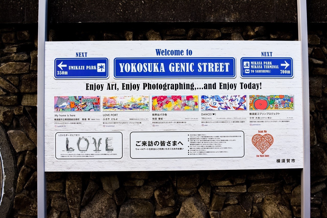 JR요코스카역에서 칸논자키(観音崎)까지 해안으로 이어지는 약 10km의 산책길 "10,000미터 프롬나드(바닷바람의 길)"의 미카사 공원에서 우미카제 공원까지의 보도에 있는 【"YOKOSUKA"에서 "세계"로 "LOVE"를 발신】이 테마인 길이 50m의 "촬영 효율이 최고"인 포토제닉한 월아트입니다.