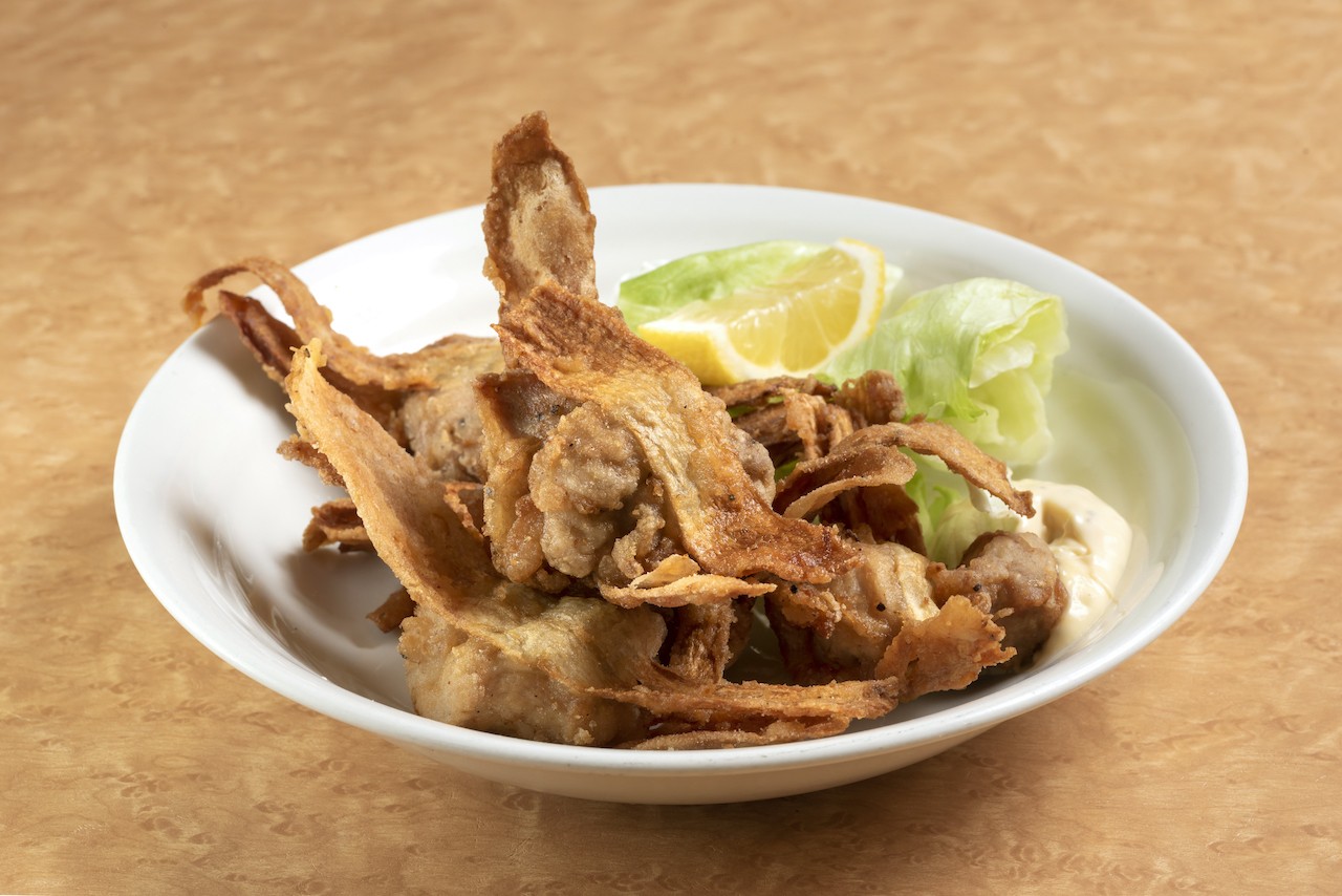 미사와시에서 공수한 우엉과 마늘을 포함한 신선한 현지 재료로 만든 지역 특산물 후라이드 치킨입니다.