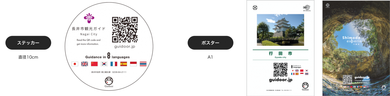 観光スポットなどにステッカーやポスターを貼っていただくことで、旅中でもQRコードから簡単にGuidoorへアクセスすることが可能です。自動で使用端末の設定言語が表示されるため、言語を切り替える必要なく、観光情報や避難場所などをチェックできます。