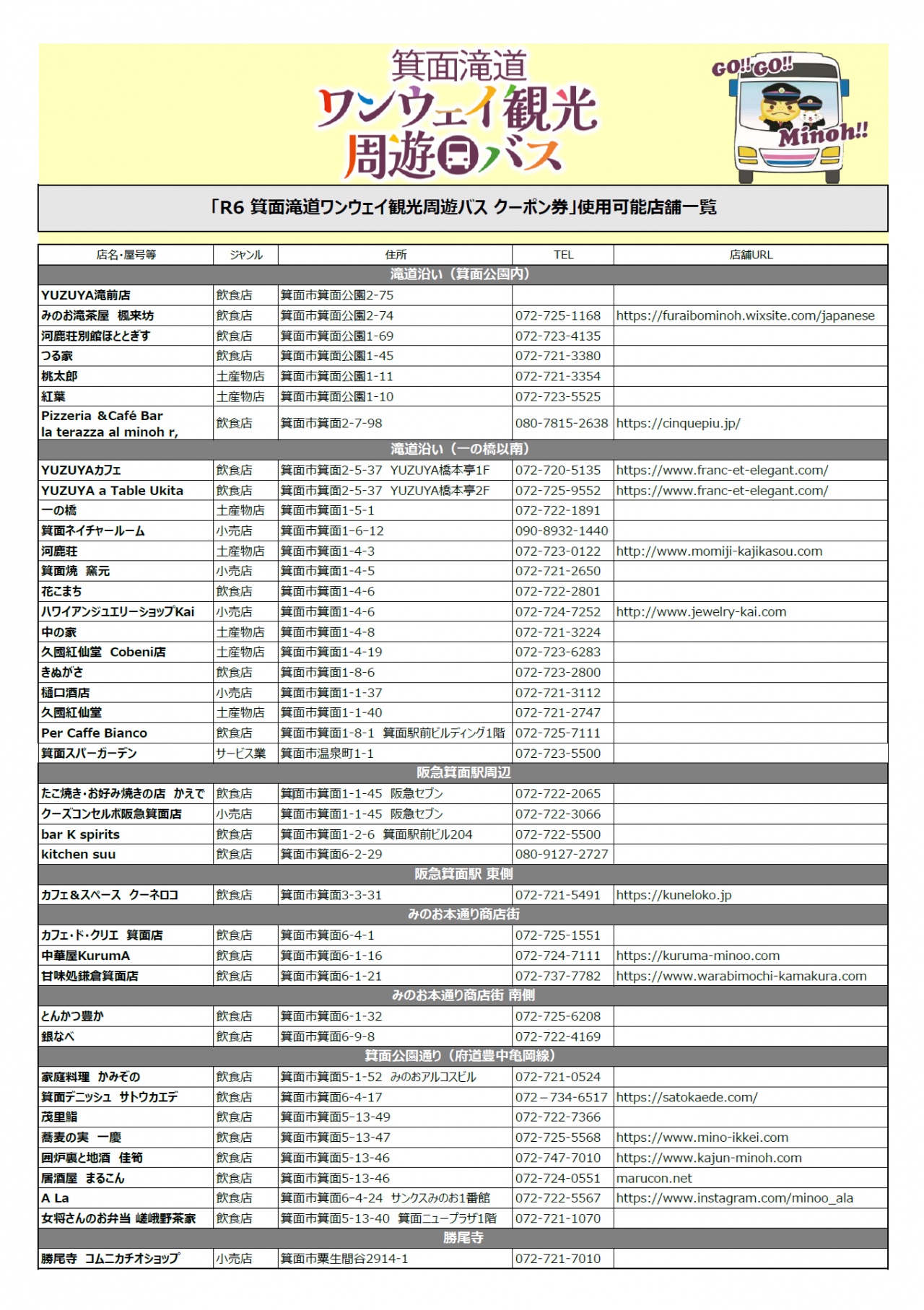 「箕面滝道ワンウェイ観光周遊バス クーポン券」使用可能店舗一覧
