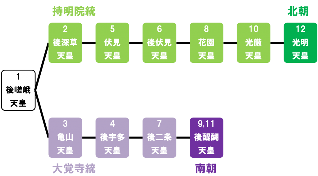 後醍醐天皇や光厳天皇が並んで出てきて少々ややこしいと思いますので、ここで当時の皇室について簡単に説明をしておきたいと思います。