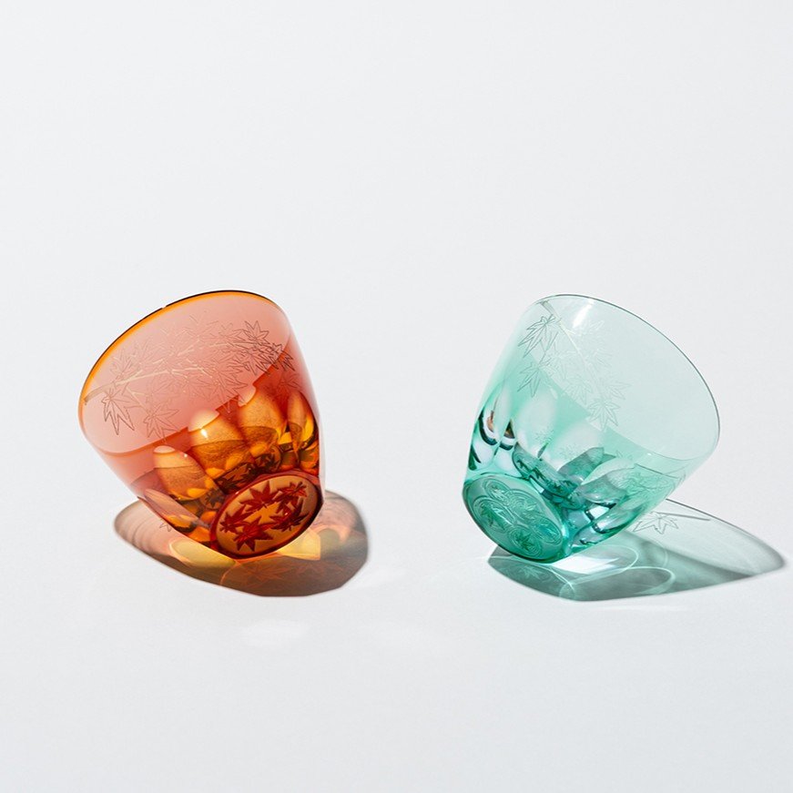 いずれのデザインも、グラスの底面に繊細に刻まれており、飲み物を注ぐと、模様が光に反射して側面へと広がります。グラスの中に、季節の情景がそっと映し出されるように──