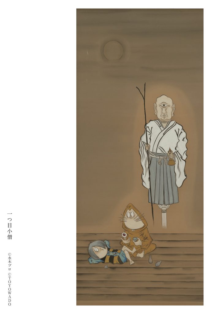 「ゲゲゲの鬼太郎」でおなじみのキャラクターたちと、延暦寺に伝わる七不思議の妖怪「一文字狸」「一つ目小僧」や「六道踊り」などとコラボレーションした7作品が登場します。