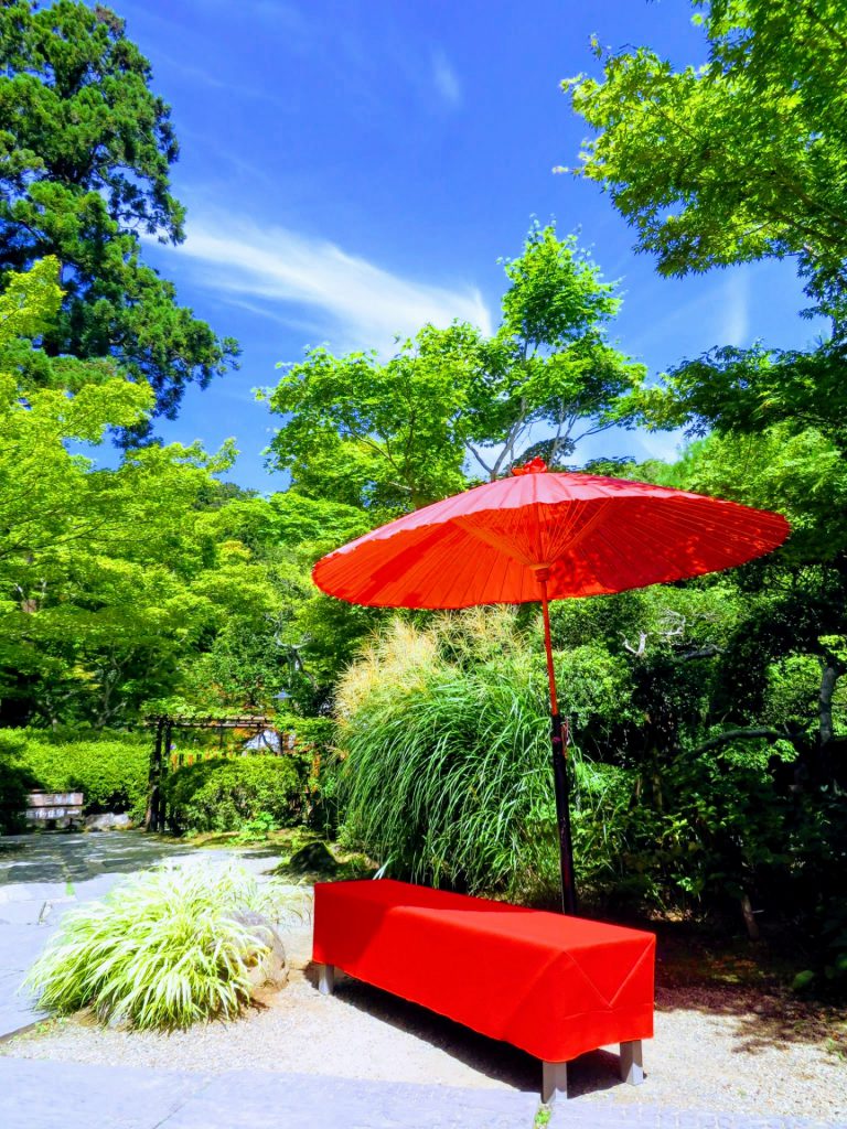 野点とは元々、屋外でお茶を入れて楽しむ茶会のことを表しています。野点傘は、前述の3つの傘に比べるとサイズも大きく、自力で立たせることが出来ないので、傘立台、毛氈(もうせんと呼ばれるマット)、床几または縁台(お茶屋などで見るひじ掛けのないベンチのような腰掛)など支えるための周辺の道具が必要となります。