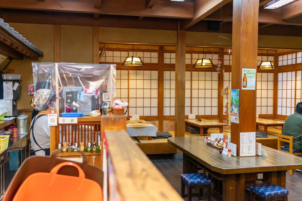 大師茶屋のどこか懐かしい、落ち着いた雰囲気の店内にはテーブル席と座敷席があります。ペット連れでも利用できる心地のよい外席は特に人気です。