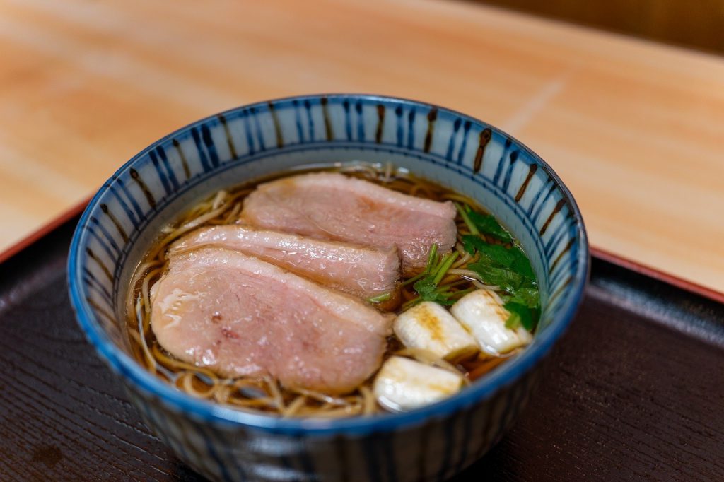 「鴨南」(1,500円)に使われる肉厚な鴨肉は、低温調理で丁寧に仕込まれています。とても柔らかく、ジューシーな仕上がりで、鴨の旨味と、ほのかな甘みがしっかりと味わえます。温かいおそばなので麺は「二八そば」がおすすめです。