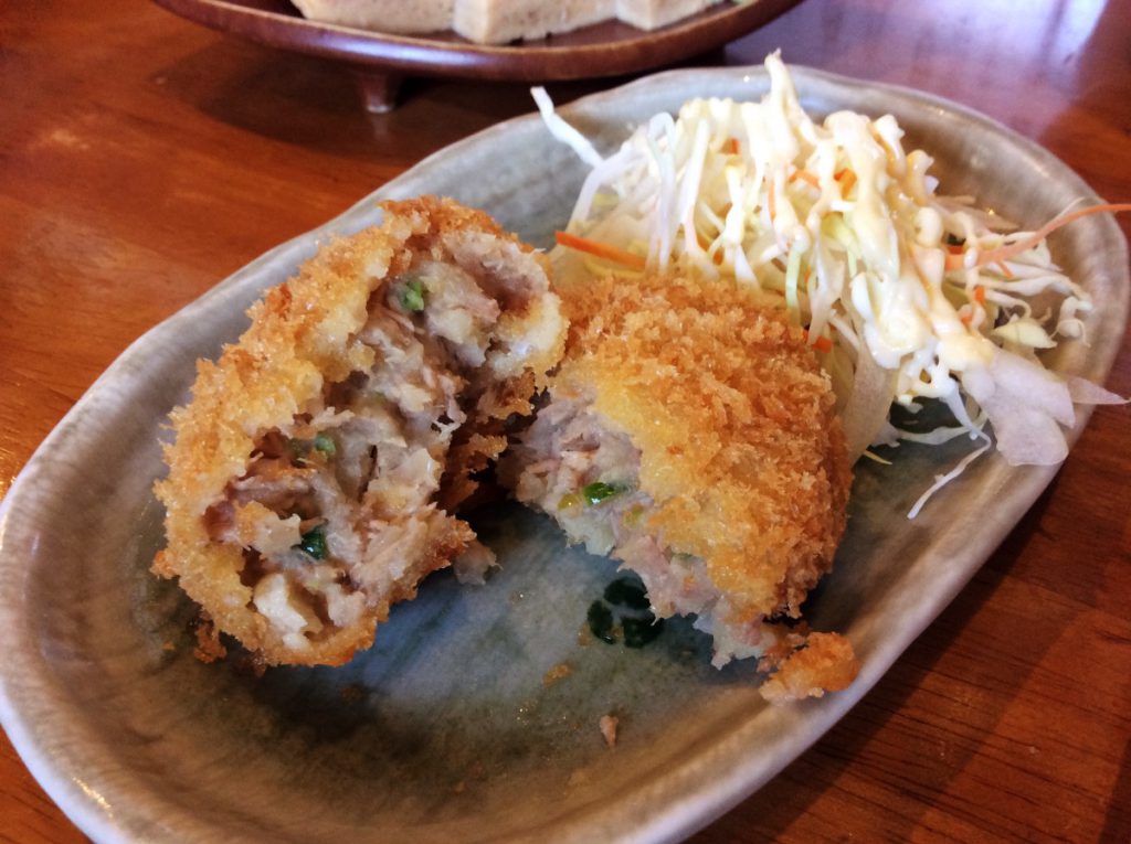 「まぐろコロッケ(¥220)」は『鴨鶴』さん開店当時からの人気オリジナル商品です。ショウガ風味の丁寧に仕込まれたまぐろが沢山入っています。