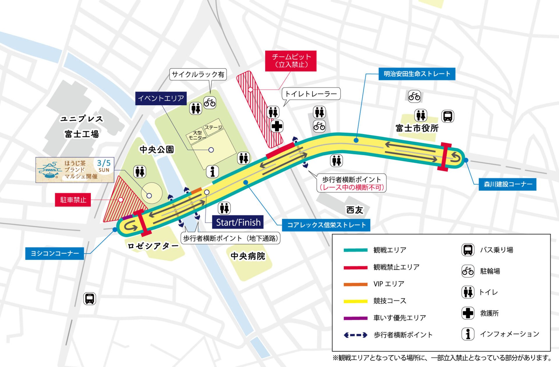| 会場 | 〒417-8601富士市永田町1-100地先周辺 富士市道臨港富士線(通称:青葉通り) 富士市役所前特設周回コース(1.8km) |