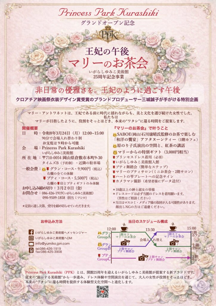 倉敷美観地区にある「いがらしゆみこ美術館」(岡山県倉敷市、運営:株式会社明日絵)は、2026年に開館25周年を迎えるのを機に、体験型文化空間「Princess Park Kurashiki(PPK)」としてリニューアルする。グランドオープンを記念し、2026年3月24日にアフタヌーンティーイベント「王妃の午後 マリーのお茶会」を開催する。参加申込の締切は3月20日(金)。