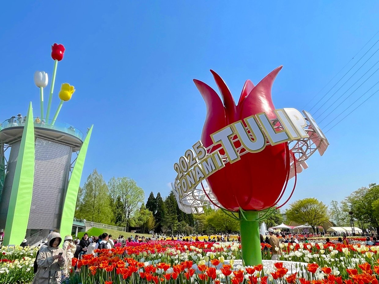 会場となるのは「砺波チューリップ公園」。代表的な見どころであるチューリップタワーやスカイウォークからは、大花壇を彩るチューリップの“地上絵”を一望でき、まるで花の海に包まれたような感覚に。2025年のテーマ「花と笑顔の咲く春 となみ」にふさわしく、訪れる人の表情も自然とほころびます。