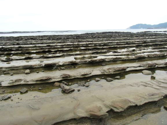 これらは約700万年前、海中にできたた水成岩(固い砂岩と軟らかい泥岩が繰り返し積み重なった地層)が隆起し、長い歳月をかけて波に洗われ、固い部分だけが板のように積み重なってできたものです。