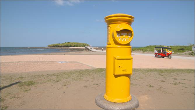 まず目に入るのは美しい砂浜とこの幸せの黄色いポスト📫