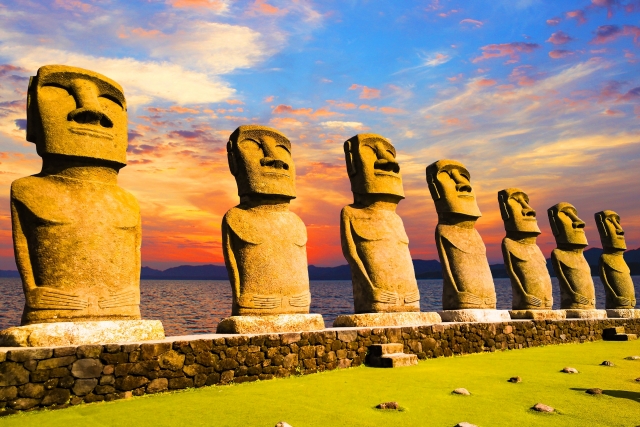 モアイ像と言えばイースター島が有名ですが、この光景は宮崎のサンメッセ日南で見られるのです。