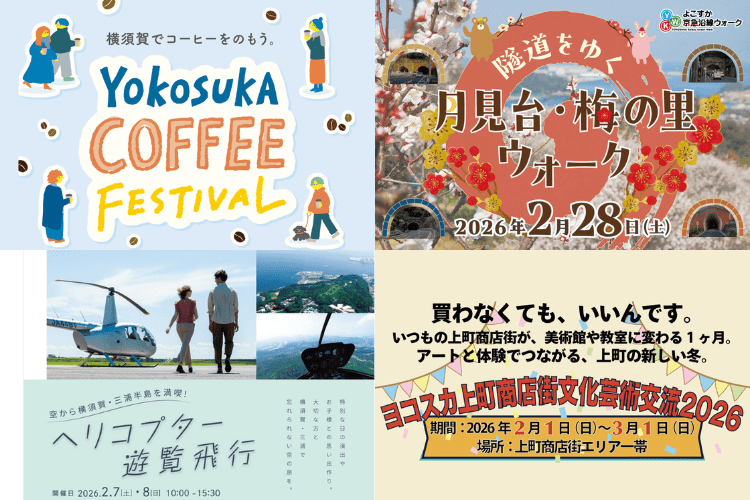 2月の横須賀市では、街の文化や景色、季節の自然に触れられるイベントが開催されます。コーヒーを楽しむフェスティバル、上空から周辺を眺望できる遊覧、歴史ある隧道や話題の月見台住宅を経て梅の里へ向かうウォーク、商店街を舞台にした文化芸術交流など、多彩なラインアップです。ここでは、2026年2月に開催される主なイベントを紹介します。