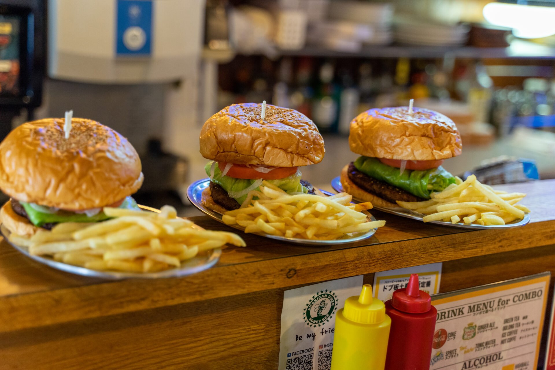 ハニービーの店内はまさにアメリカンダイナーそのものです。創業当初からほとんど変わらないというレイアウトは、訪れる人々を古き良き時代のアメリカへとタイムスリップさせたような感覚にさせます。