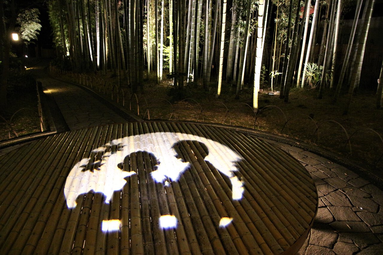 時間限定で小径の円形ベンチに切り絵のアートスポットが映し出され、昼間とは一味違う温泉街ナイトウォークを楽しむことができます。