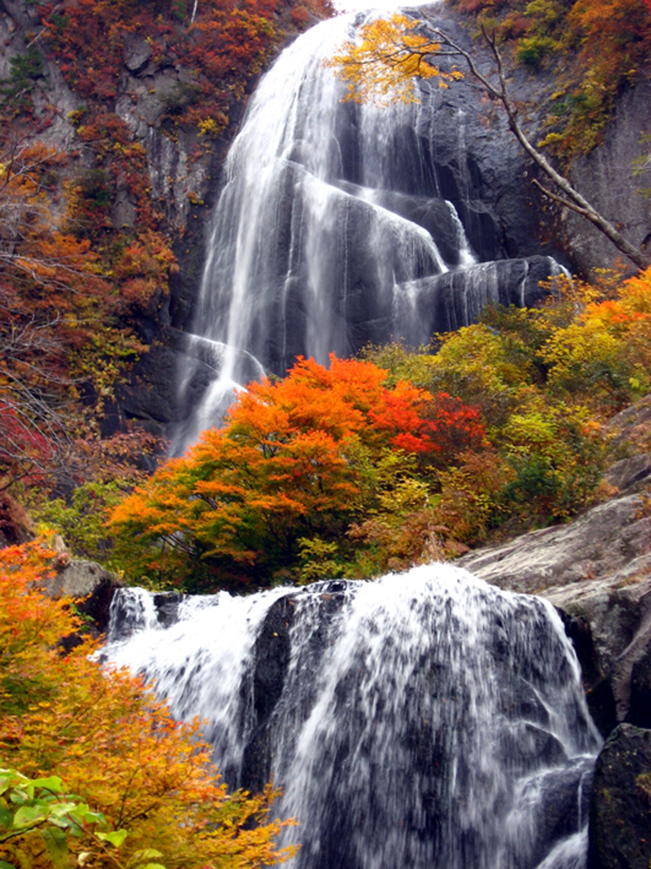 落差90mある2段の滝で、日本の滝100選の第2位に選ばれた事があります。
