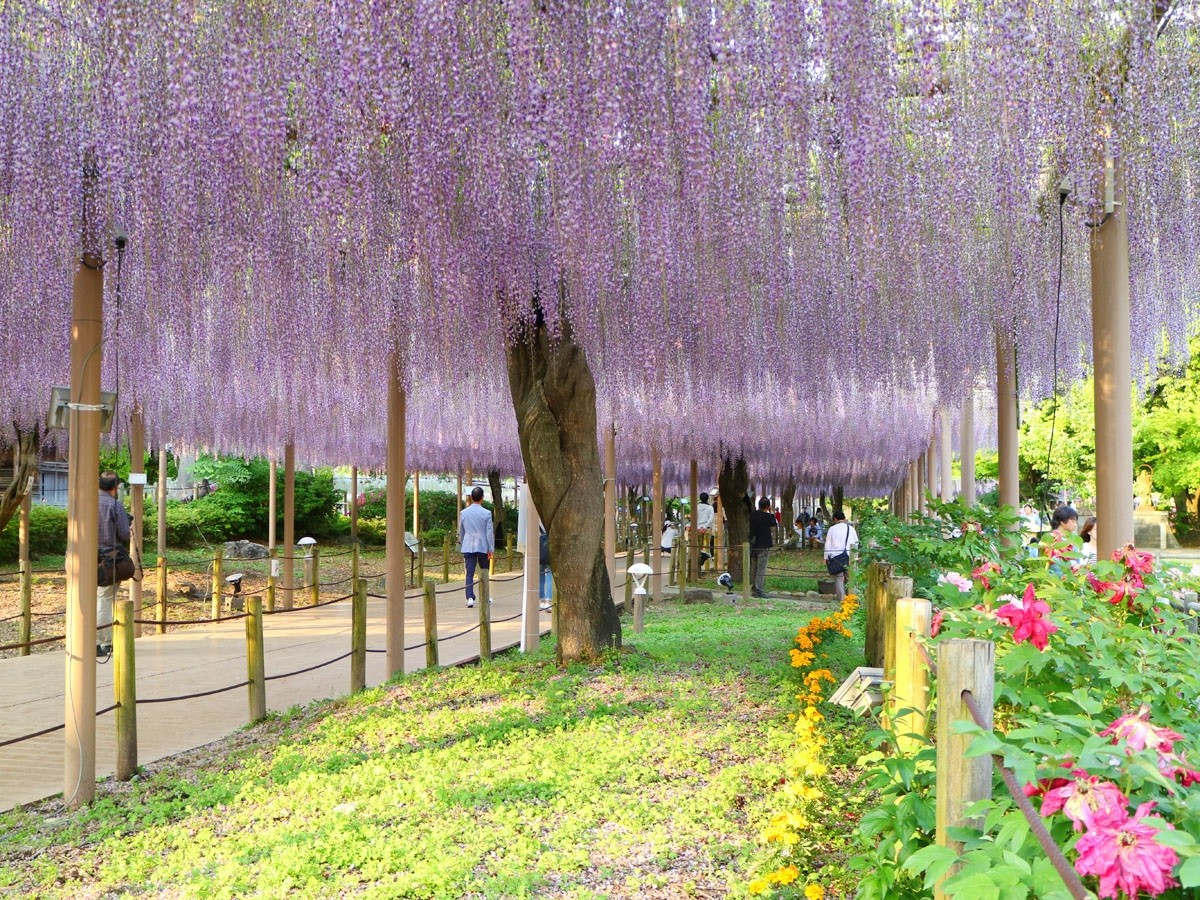 毎年4月中旬から5月上旬にかけては、約60本・11種類以上の藤が咲き誇り、紫や白、ピンクなどの花房が藤棚を美しく彩ります。