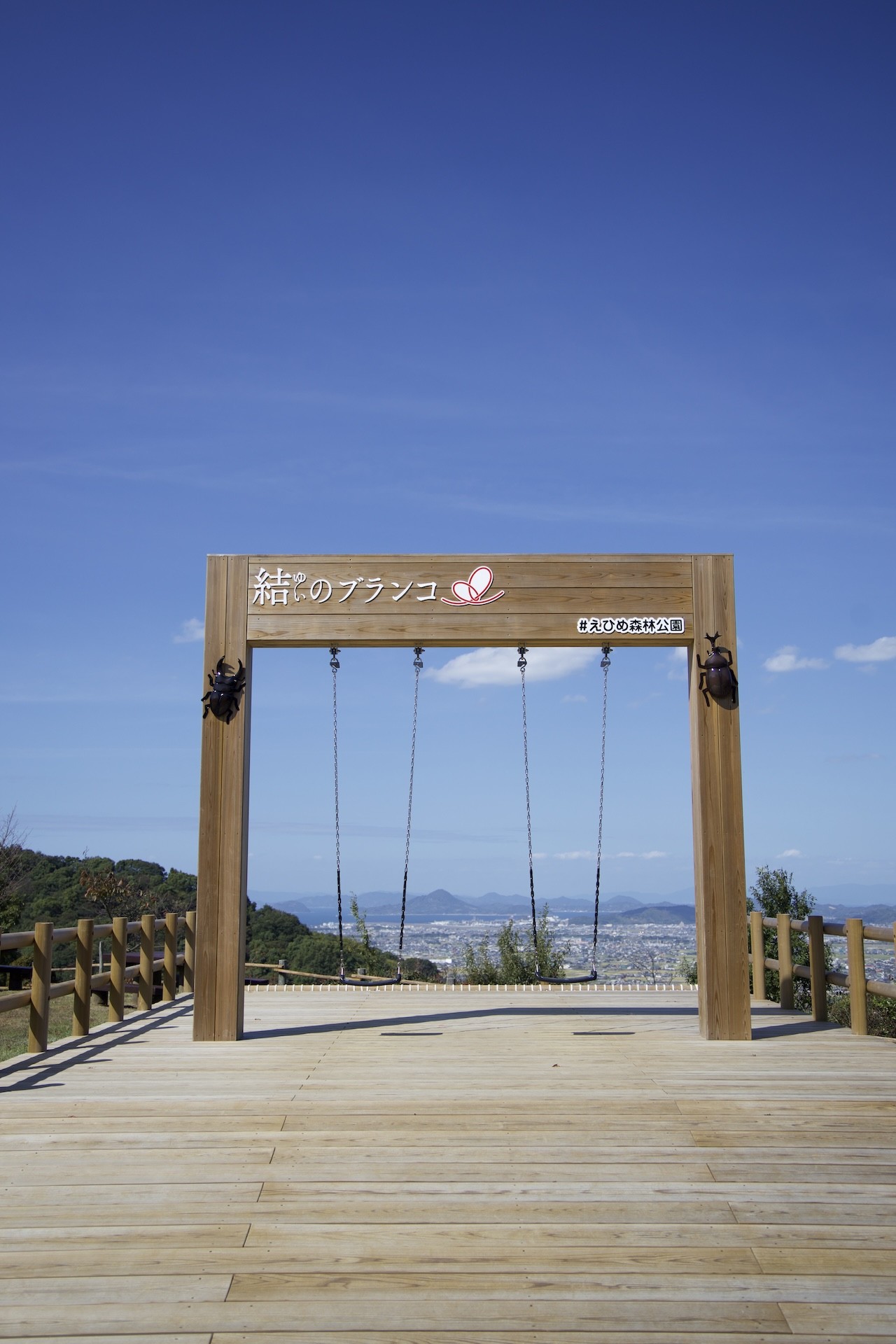 第二林間広場の「結のブランコ」に乗って、道後平野を眺めながらゆったり楽しむのがおススメです。