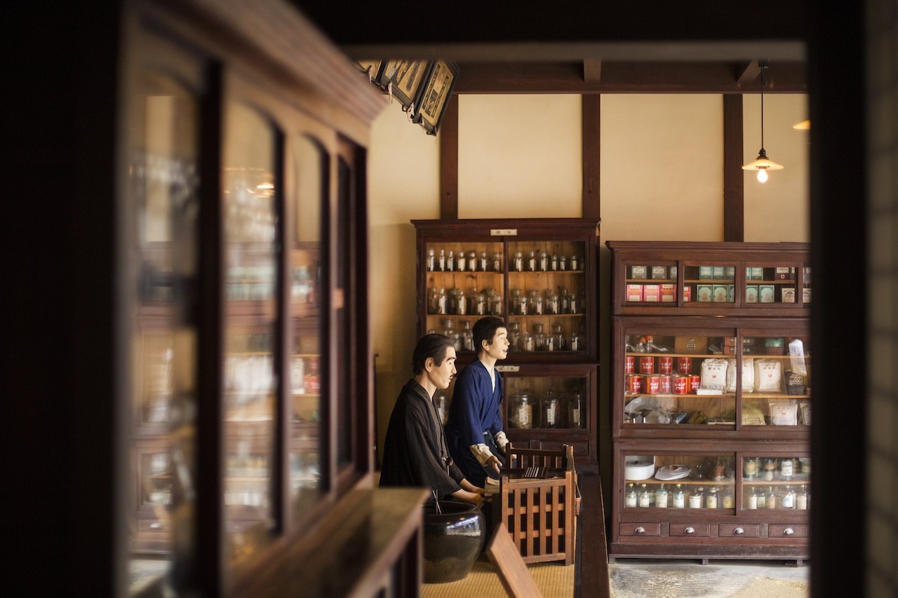 江戸時代から明治時代の商家を活用した内子町の歴史や暮らしを学べる資料館。 薬屋の店舗と家屋を再現し、棚に並ぶ薬や雑貨、看板や商品に至るまで細かく再現しているほか、当時の暮らしぶりを人形を使って展示しています。