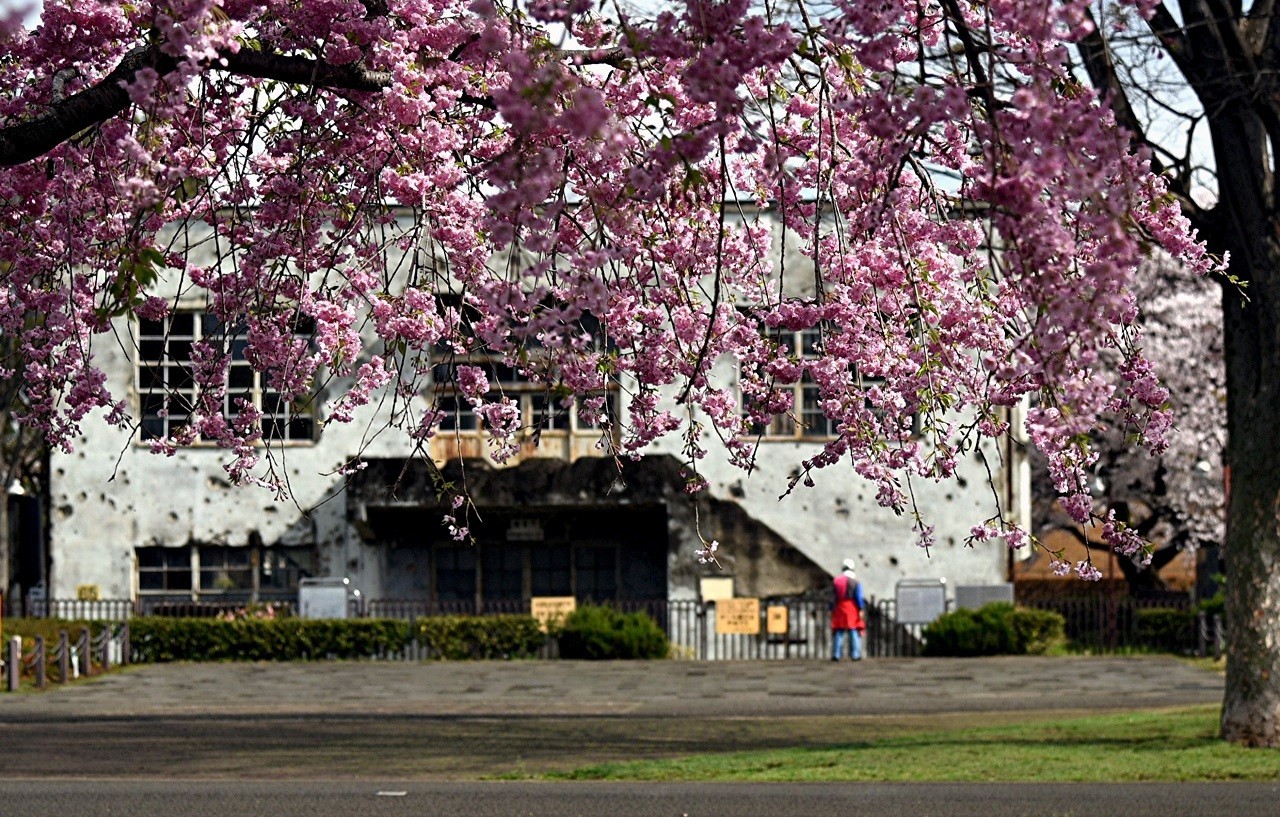 【第6回東やまと市まちフォトコンテスト エプソン賞「さくら暖簾」】 軍需工場の設備として昭和13年に建設され、空襲の機銃掃射の弾痕が残る建物は、市史跡となり戦争の恐ろしさを今に伝えます。