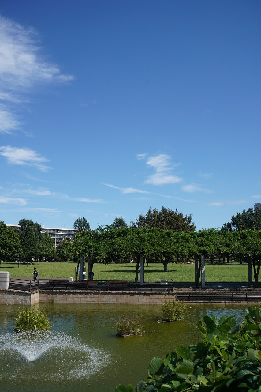 一周500メートルの円形芝生広場を中心に、旧鉄道学園時代からのサクラ・ケヤキ・イチョウなどの巨木を活かし、池・噴水を加えた水と緑のゆったりした公園です。