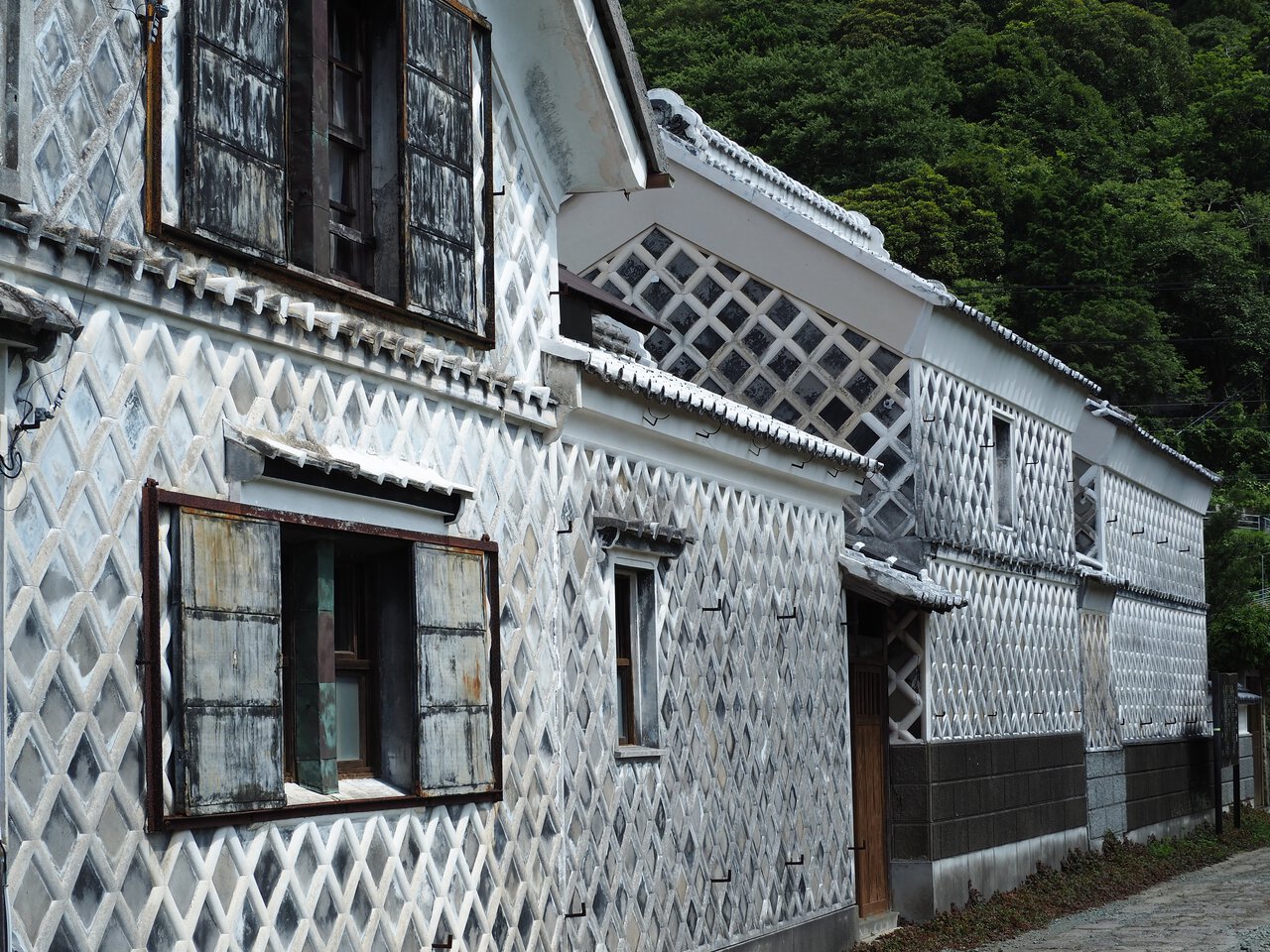 なまこ壁は壁面に平瓦を並べて貼り、「目地」と呼ばれるその継ぎ目の部分に漆喰をかまぼこ型に高く盛り上げて塗る左官工法です。