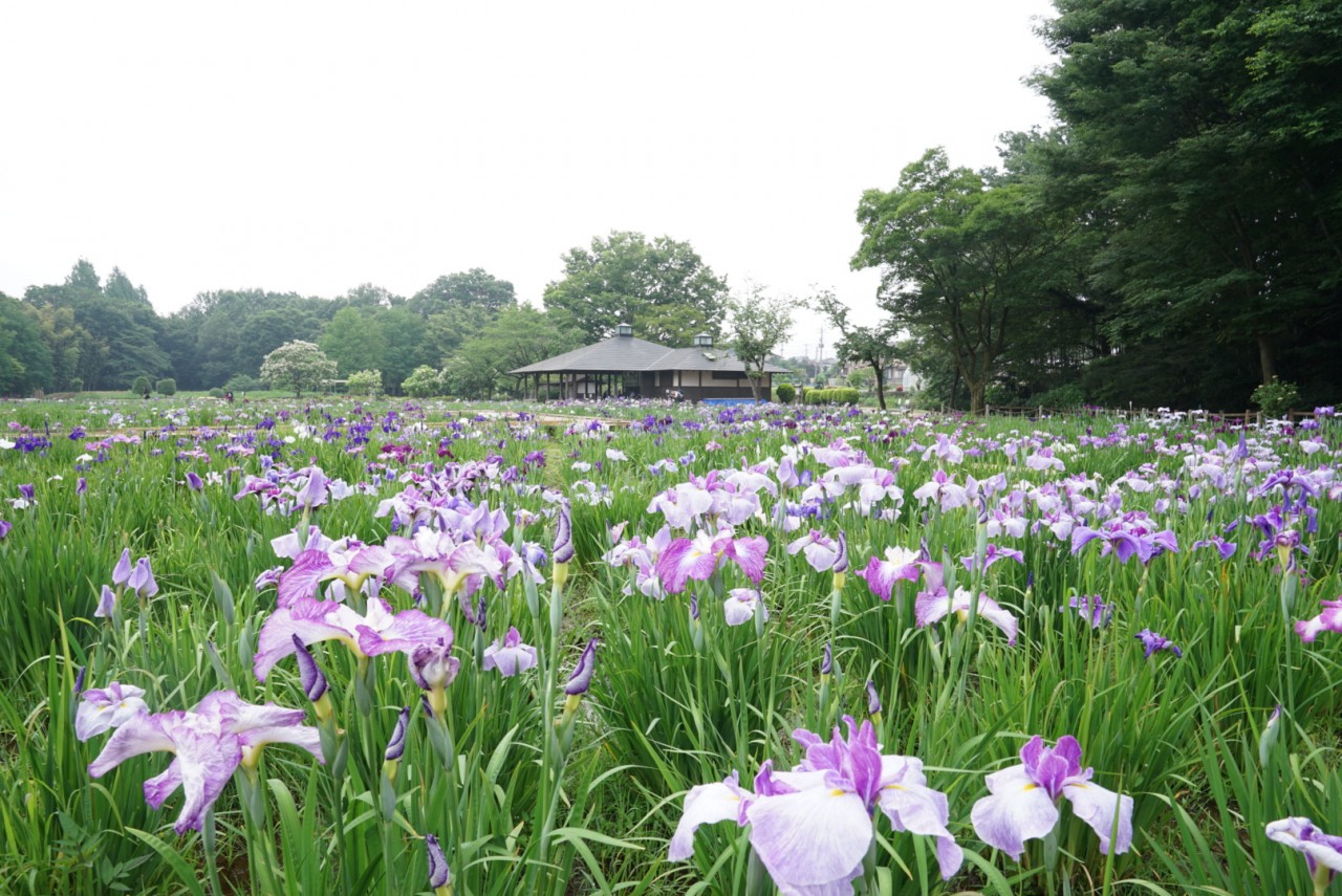 「トトロの森」とも呼ばれる八国山緑地を背景にした自然豊かな公園で、約600種8,000株10万本の花菖蒲が咲き誇る景観は新東京百景にも選ばれました。
