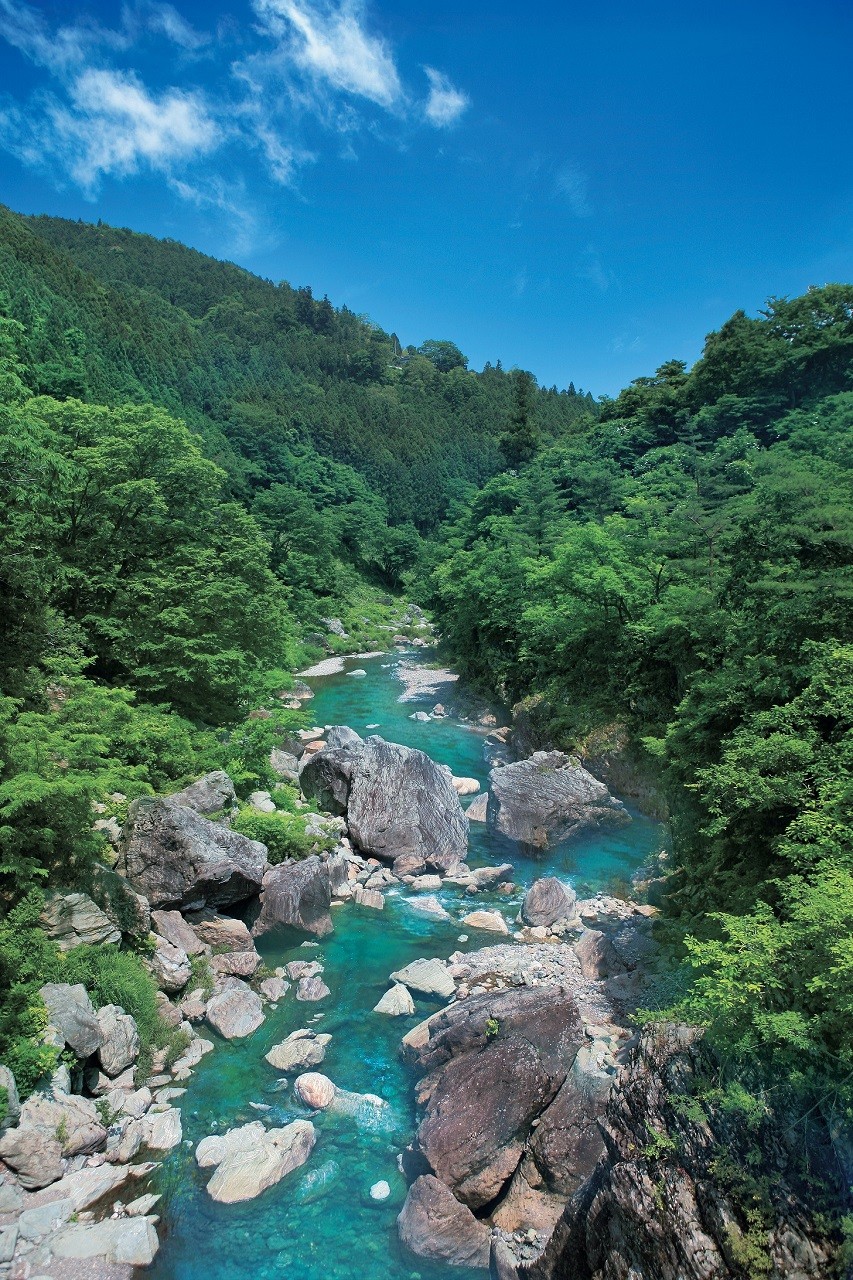 下久保ダムのすぐ下流に位置する三波石峡は、約1.5㎞にわたって三波石の巨岩・奇岩が並び、これが木々の緑や紅葉と相まって、美しい景観を作り出しています。