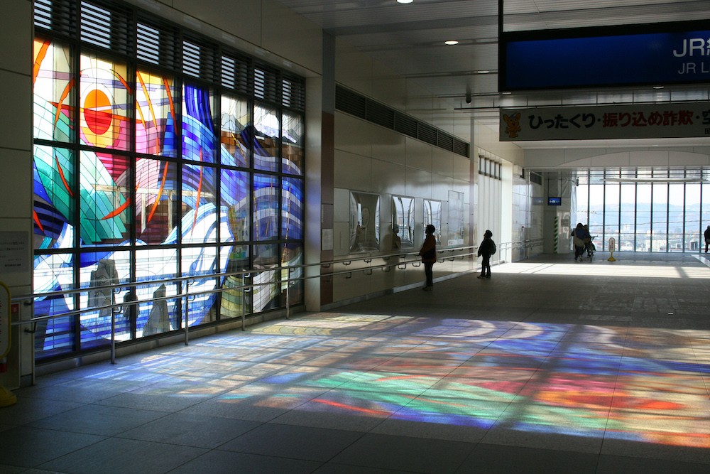 拝島駅の自由通路内の窓に昭島市と福生市の文化をつなぐ架け橋として、アキシマクジラをモチーフとしたステンドグラスを設置しています。