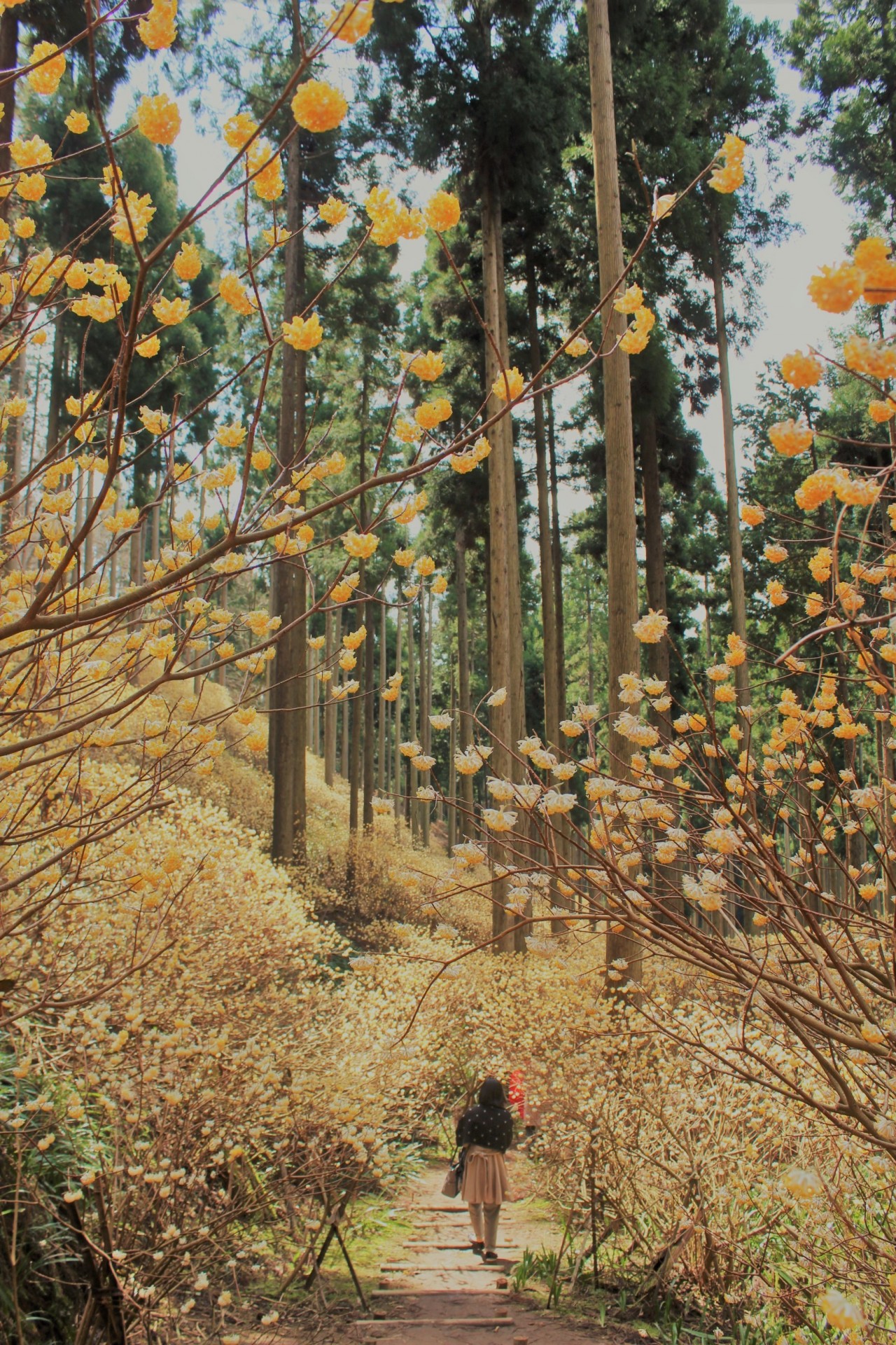 福井県おおい町との県境にある水源の里・老富では、黄色い可憐なミツマタが杉林一面を埋め尽くし、幻想的な光景が見られます。(見頃:3月下旬~4月中旬)