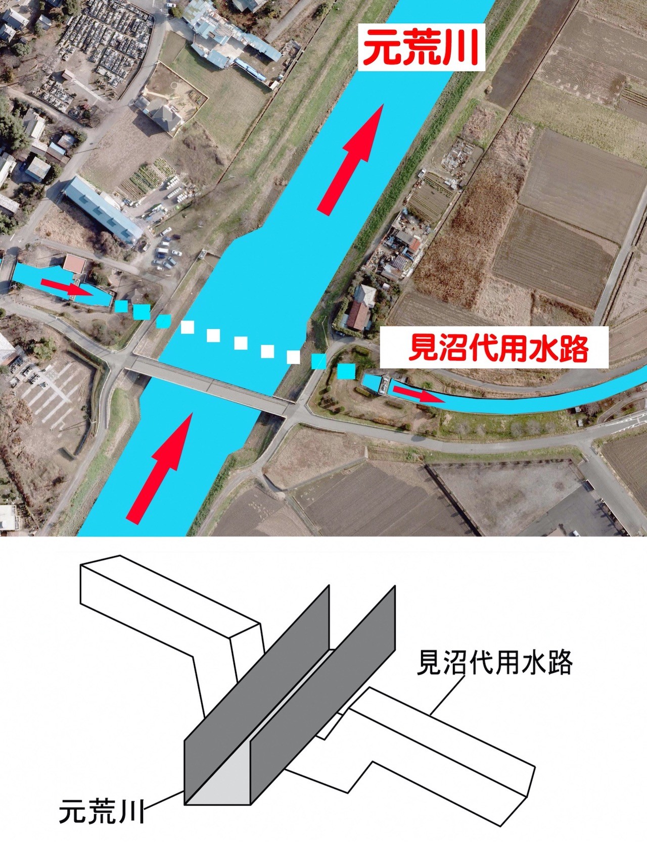 川が川の下をくぐる構造を「伏せ越し(ふせこし)」と言います。 見沼代用水が元荒川の下を通って流れており、約300年前の江戸時代(1727年) に井沢弥惣兵衛為永(いざわやそべえためなが)によって作られたものです。