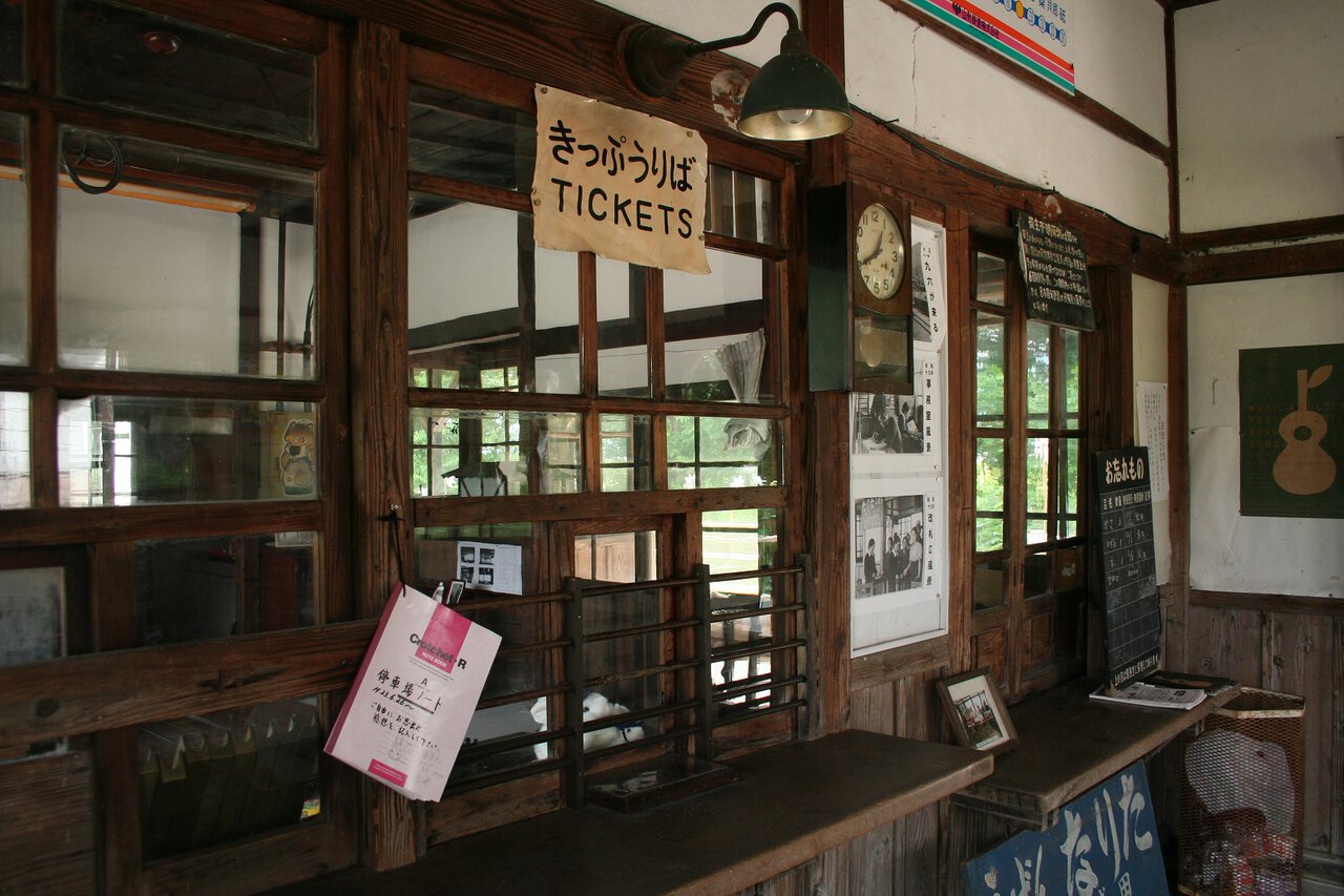 大正11年に建てられた国鉄時代の古い木造駅舎。 窓口やベンチなどが当時のまま残されており、懐かしい雰囲気が漂います。 旧事務所を活用し、地元高校生の写真展や全国から訪れる鉄道ファンとの交流を行っています。