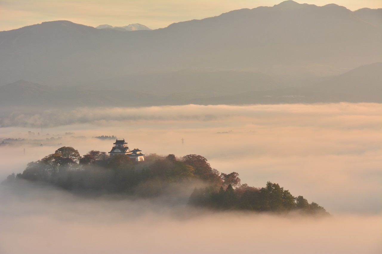 市中心部にある亀山(標高249m)にそびえる平山城で、麓には城下町が広がり、ここが雲海に包まれ亀山だけが浮かんで見える日は「天空の城」として幻想的な姿を見ることができます。