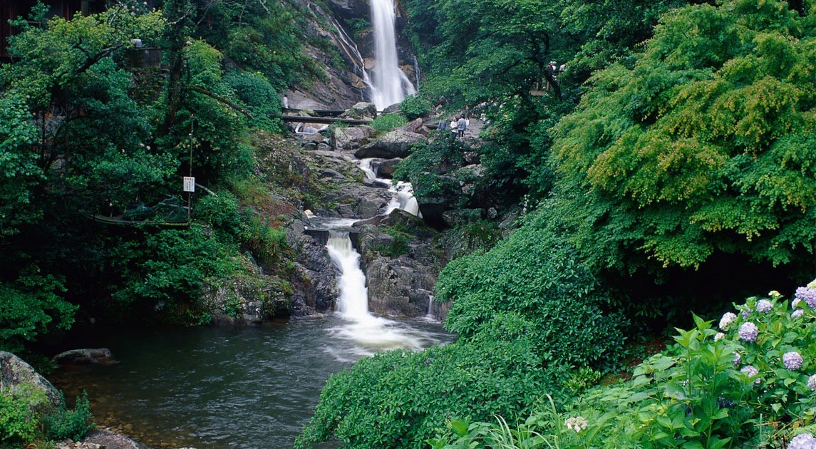落差100mの滝は、春は桜、夏は深緑、秋は紅葉と、四季折々に美しい姿を見せてくれます。