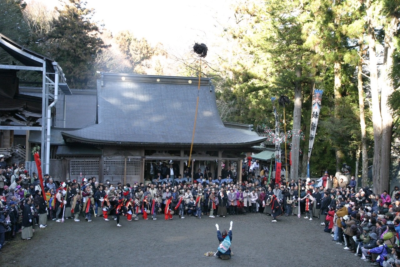この祭りは、遷座の際に、それまでゆかりのあった場所にご神幸を行うようになったことが起源とされ、総勢200人による練り行列は、早春の山里で古式ゆかしく時代絵巻を繰り広げます。