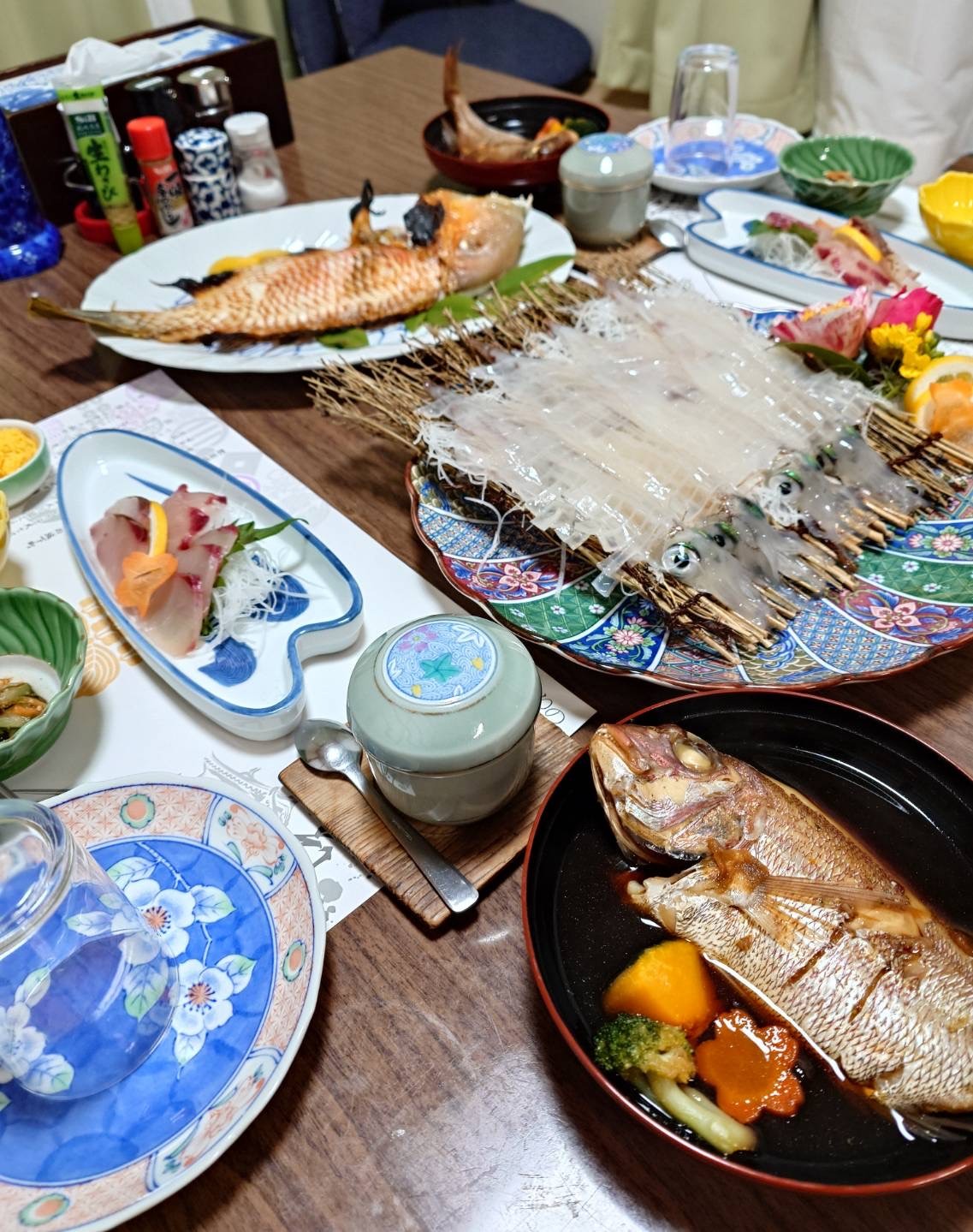 大慶の自慢は、地元の魚にこだわった料理。先代の女将である“ばあちゃん”直伝の漁師飯を受け継ぎ、旬の魚介を惜しみなく使った食事をご用意しています。 呼子名物のイカの活き造りをはじめ、刺身、煮付け、焼き魚、小鉢など、獲れたての恵みをそのままに味わえる料理は、素朴ながらも心に残る美味しさです。 メニューは季節や漁の状況によって変わり、その日ならではの一皿をお楽しみいただけます。