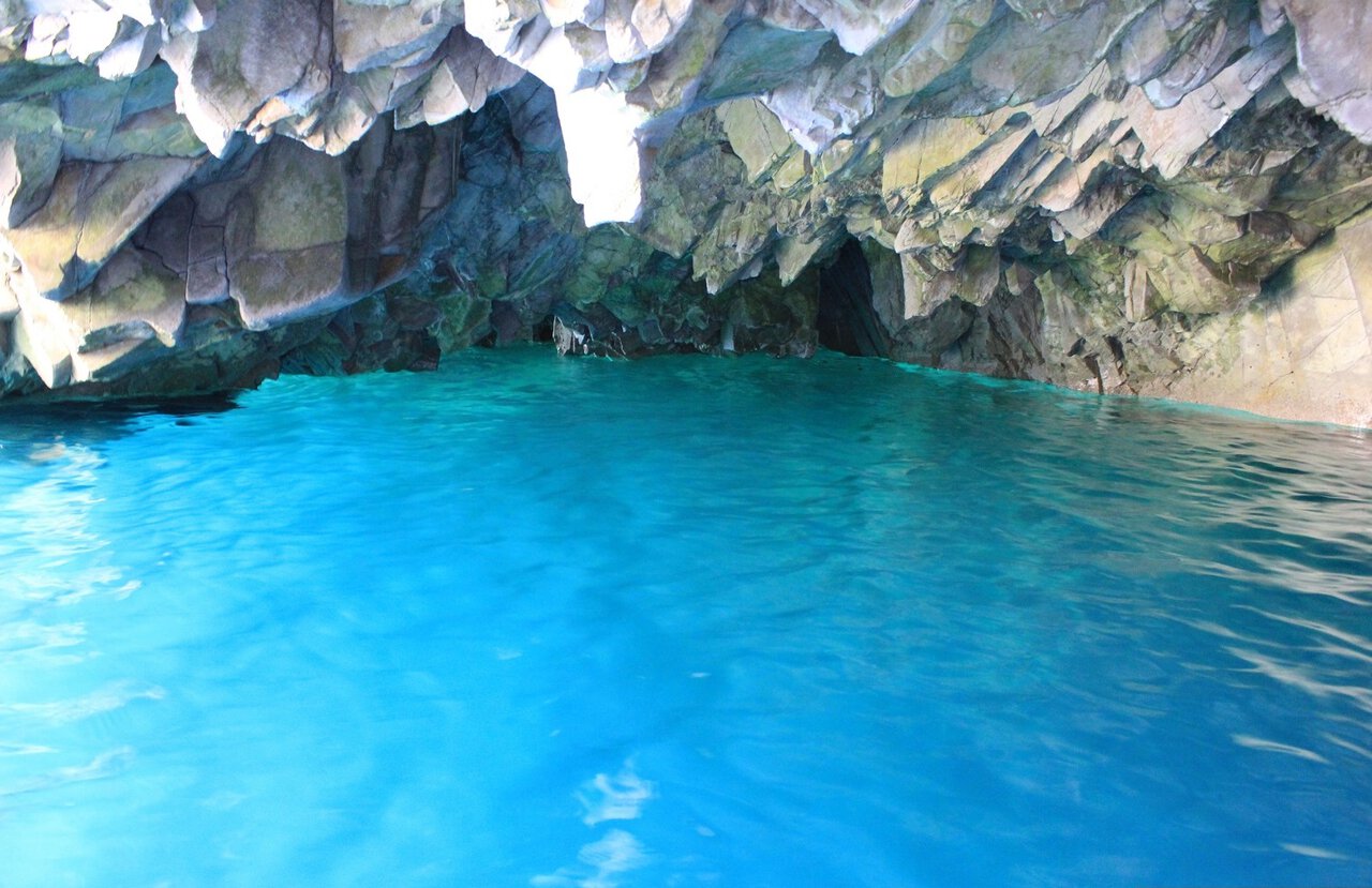 洞窟内ではエメラルドグリーンやコバルトブルーに輝く海を見ることができます。