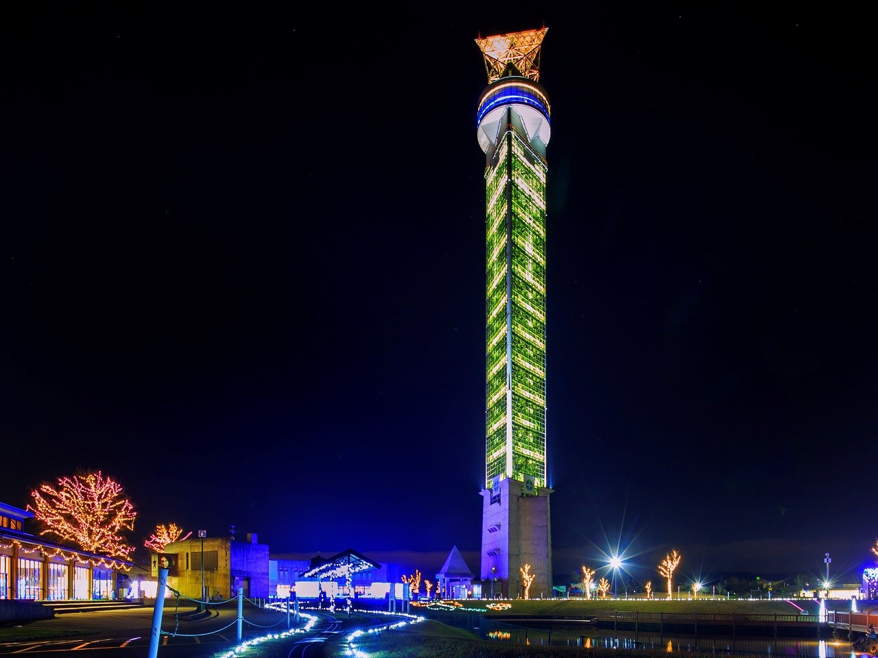 高さ100mのタワー展望フロアからは、北アルプスや田園風景などが一望でき、360°の大パノラマを楽しめます。