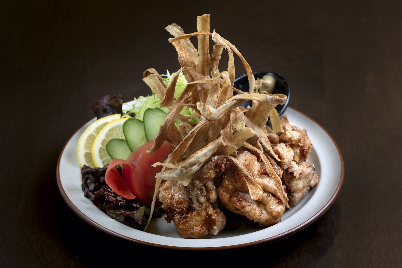 Это местная фирменная жареная курица, приготовленная из свежих местных ингредиентов, включая лопух и чеснок, выращенные в городе Мисава.